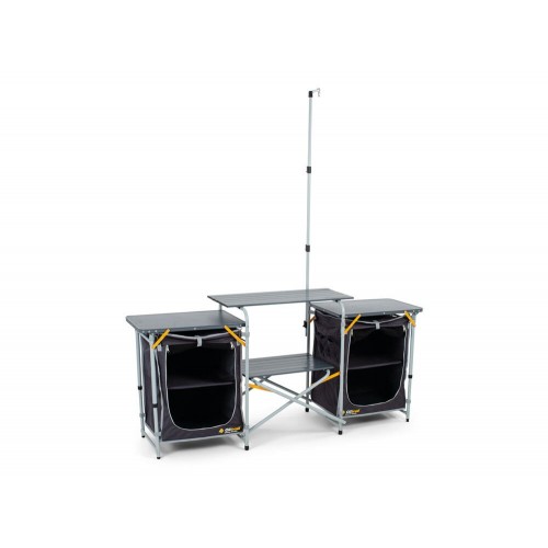 A versatile camp kitchen unit with two hanging cupboards for cooking essentials, non-slip aluminium slat top, and extra storage shelves. Great for cooking outdoors with multiple work surfaces and a built-in lantern pole.